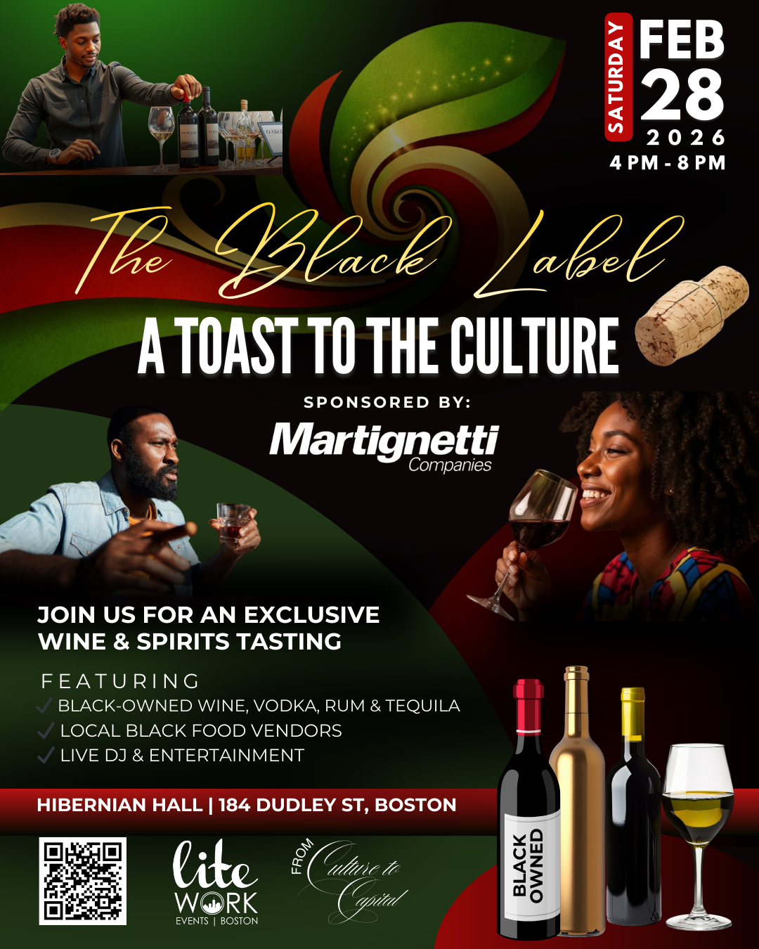 Celebrate Black excellence with an exclusive wine and spirits tasting. The event features Black-owned wine, vodka, rum, and tequila, alongside local Black food vendors and live DJ entertainment.