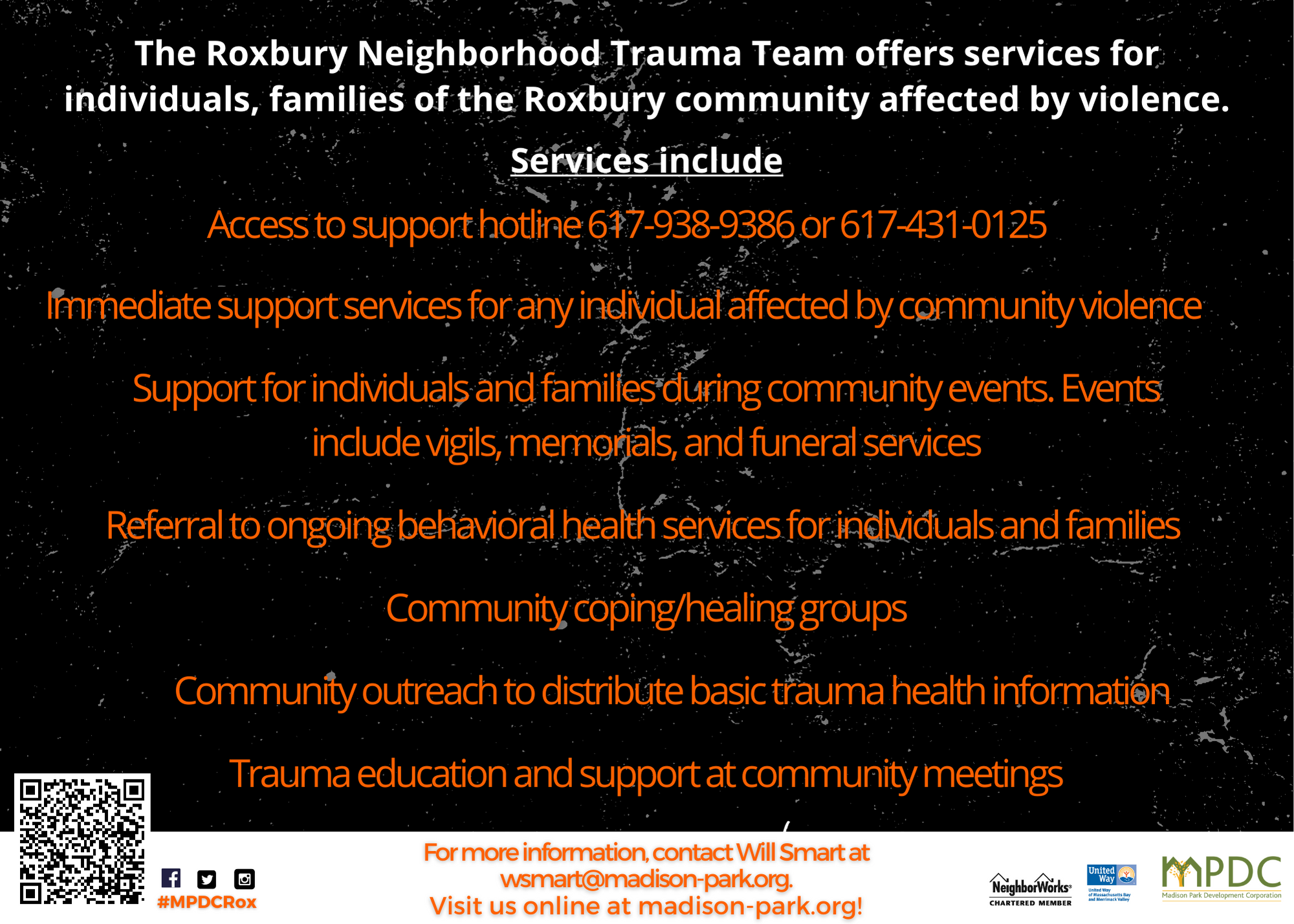Through the Roxbury Neighborhood Trauma Team, MPDC partners with Whittier Street Health to provide a continuum of services to individuals, families, close friends, and communities impacted by community violence. Three key elements of this continuum are: