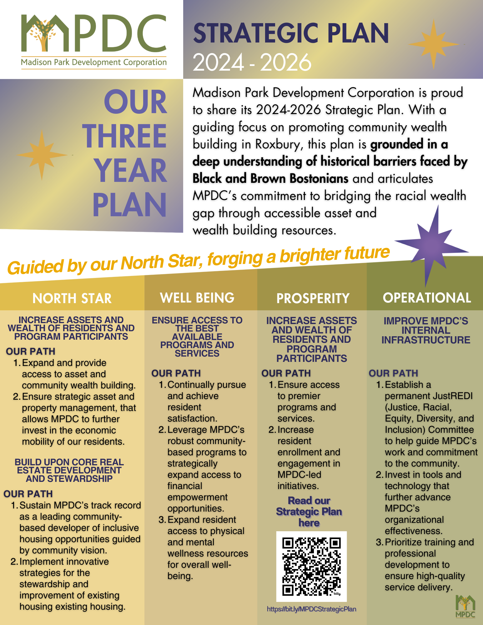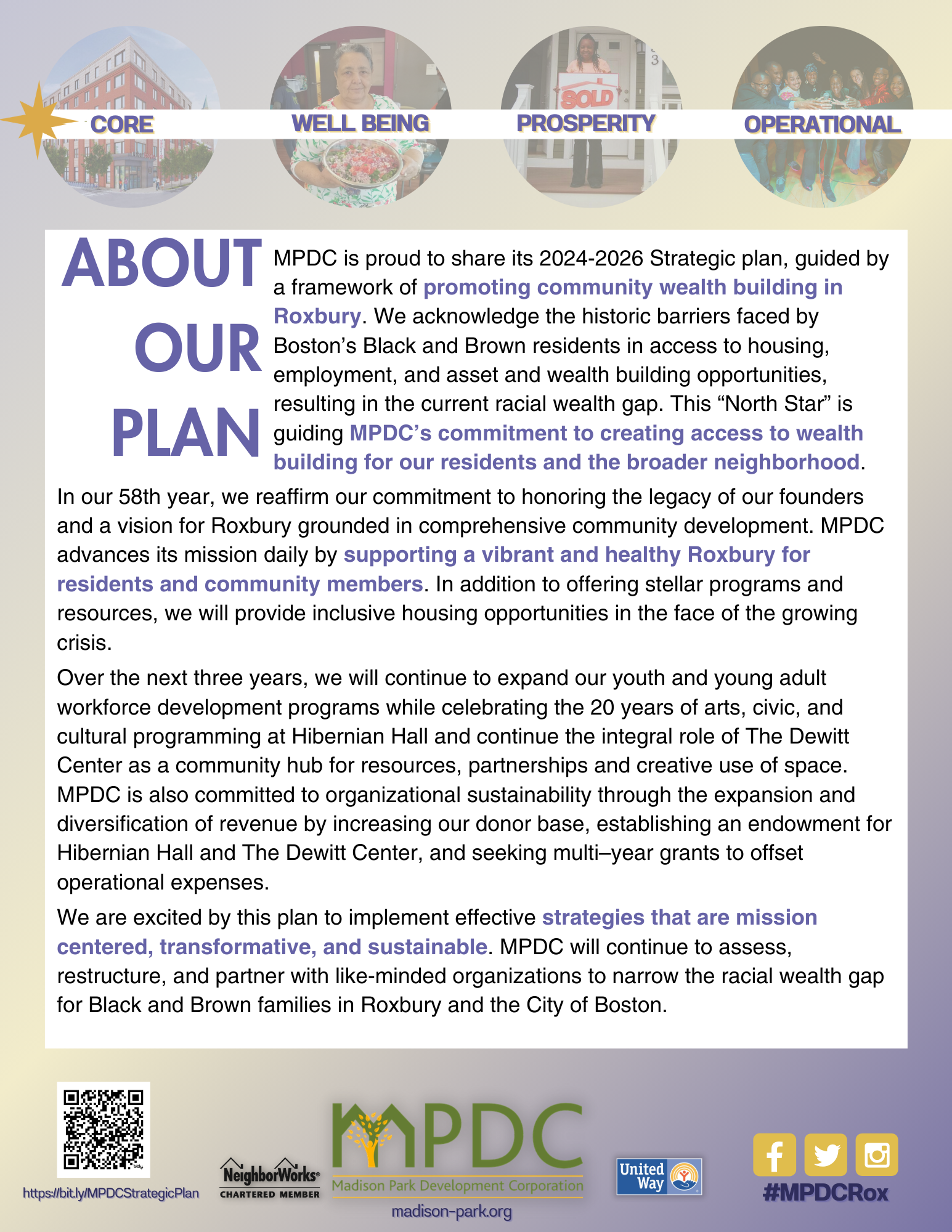 MPDC is proud to share its 2024-2026 Strategic plan, guided by a framework of promoting community wealth building in Roxbury. We acknowledge the historic barriers faced by Boston’s Black and Brown residents in access to housing, employment, and asset and wealth building opportunities, resulting in the current racial wealth gap. This “North Star” is guiding MPDC’s commitment to creating access to wealth building for our residents and the broader neighborhood.
