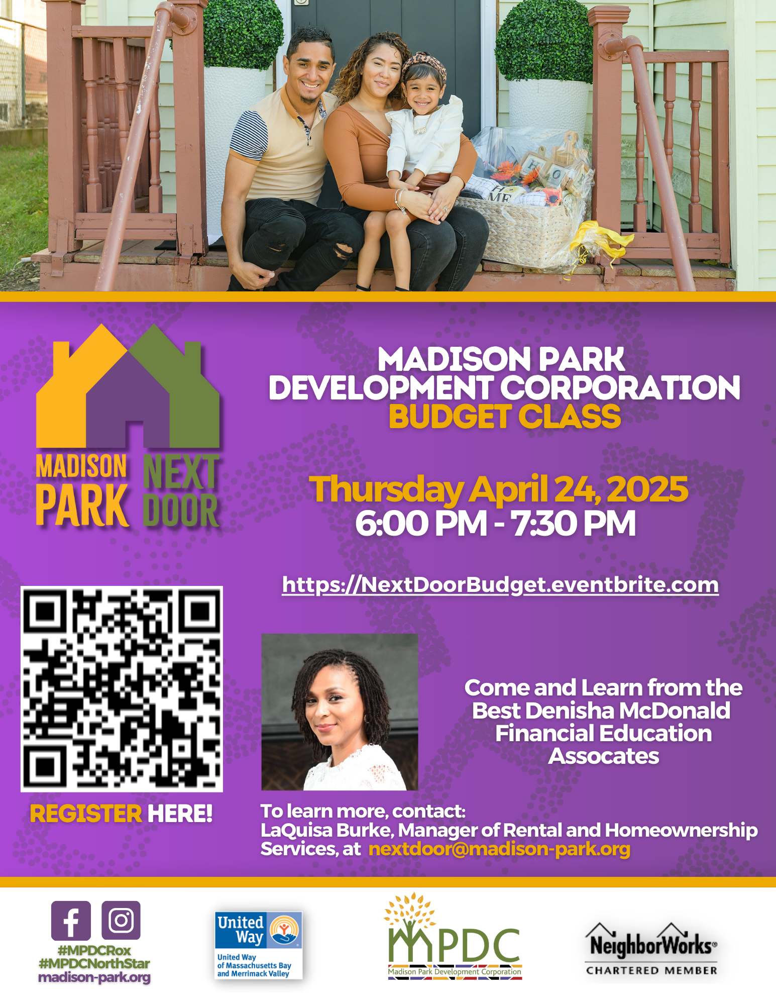 MPDC Budget ClassDate: Thursday, April 24, 2025Time: 6:00 PM – 7:30 PM Location: Online – Register at www.NextDoorBudget.eventbrite.com Learn from Denisha McDonald of Financial Education Associates to take control of your budget and homeownership journey. Contact: LaQuisa Burke at [email protected]