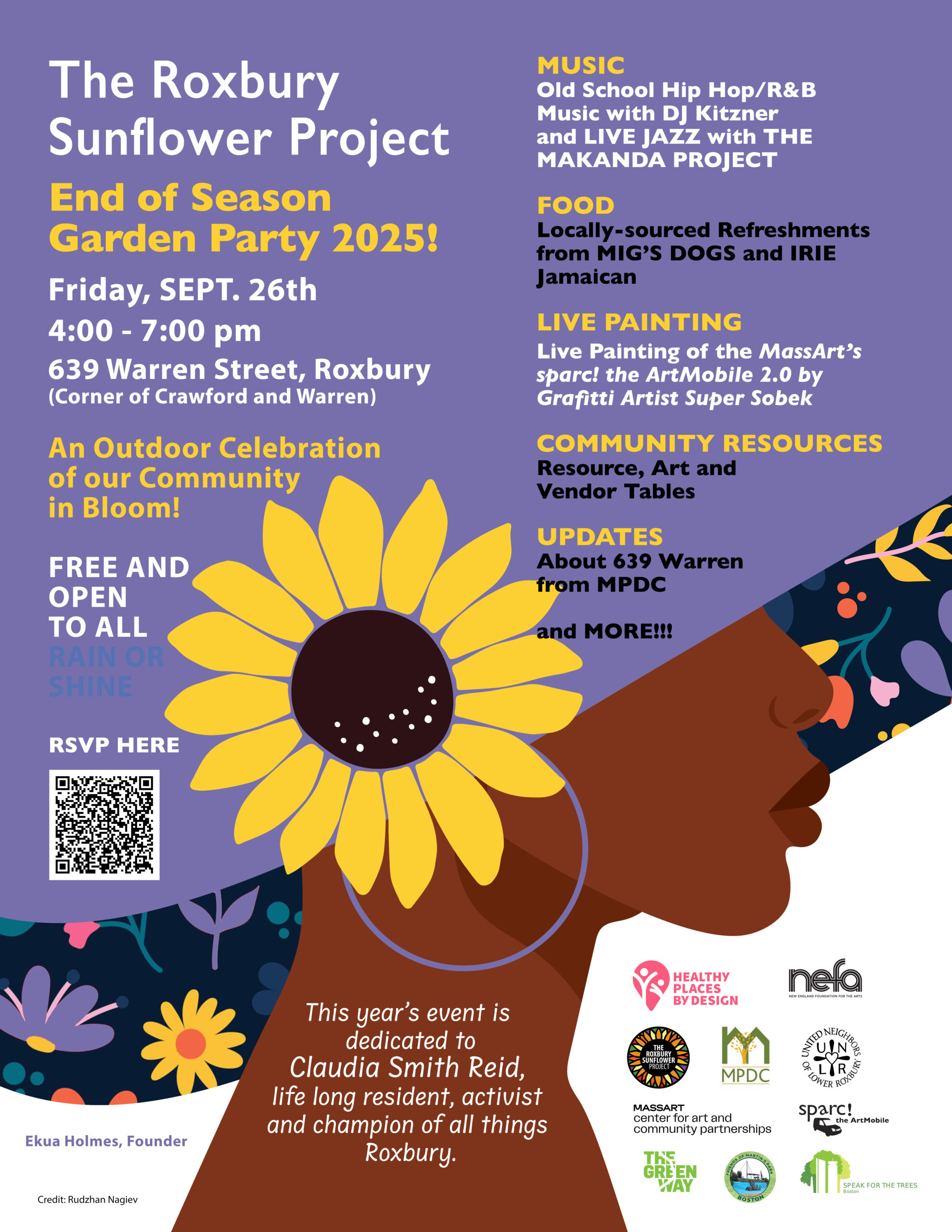 Roxbury Sunflower Project: End of Season Garden Party Friday, September 26, 20254:00 – 7:00 PM639 Warren Street, Roxbury (Corner of Crawford and Warren)Celebrate community, growth, and creativity at this vibrant outdoor event! Featuring:DJ Kitzner + Live Jazz by The Makanda ProjectFood from MIG’s DOGS & IRIE JamaicanLive painting by graffiti artist Super SobekResources, vendors, and […]