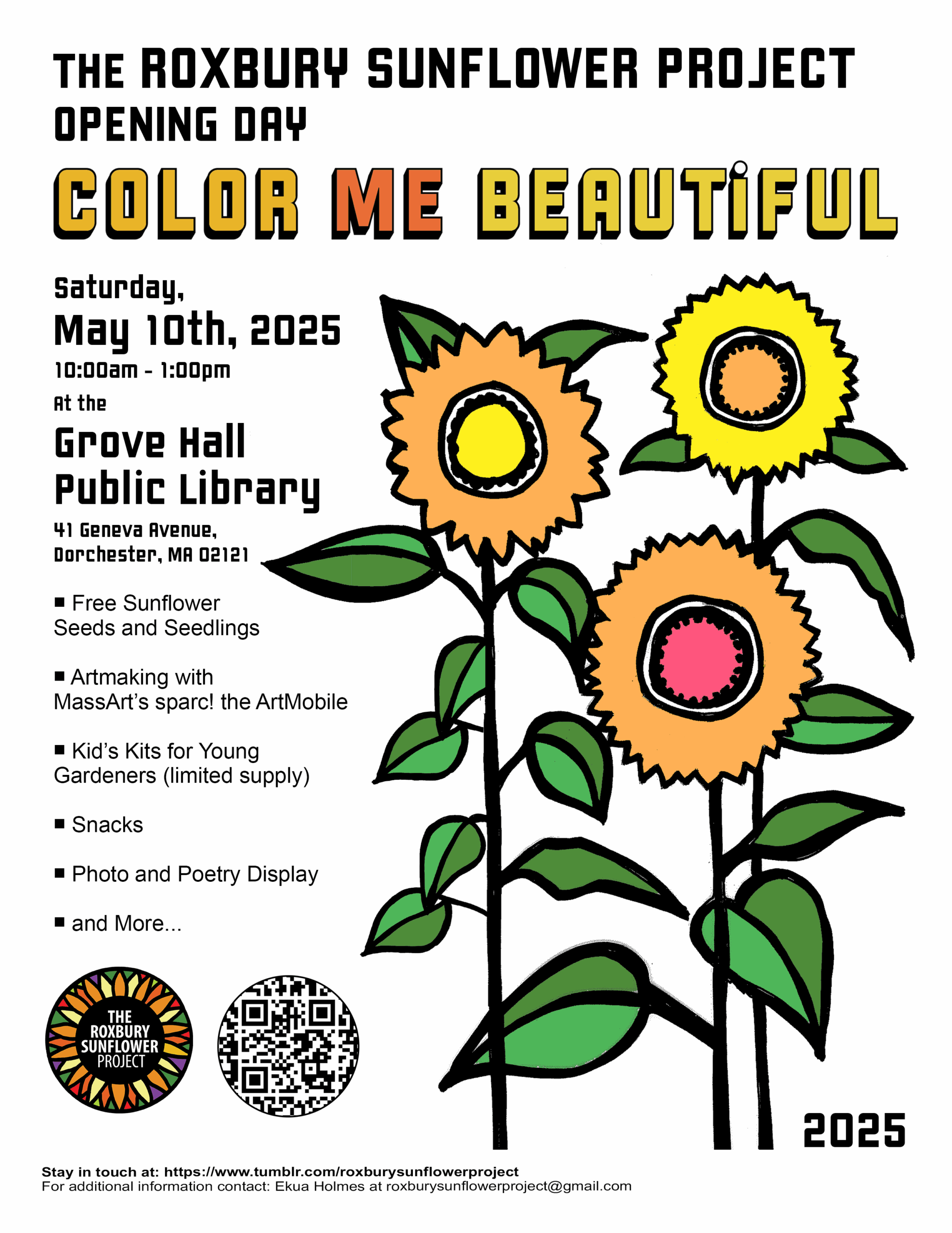 The Roxbury Sunflower Project Opening Day – Color Me BeautifulSaturday, May 10, 202510:00 AM – 1:00 PM Grove Hall Public Library, 41 Geneva Avenue, Dorchester, MA 02121 Celebrate growth, creativity, and community at The Roxbury Sunflower Project Opening Day! This vibrant kickoff event features free sunflower seeds and seedlings, interactive art-making with MassArt’s sparc! the ArtMobile, […]