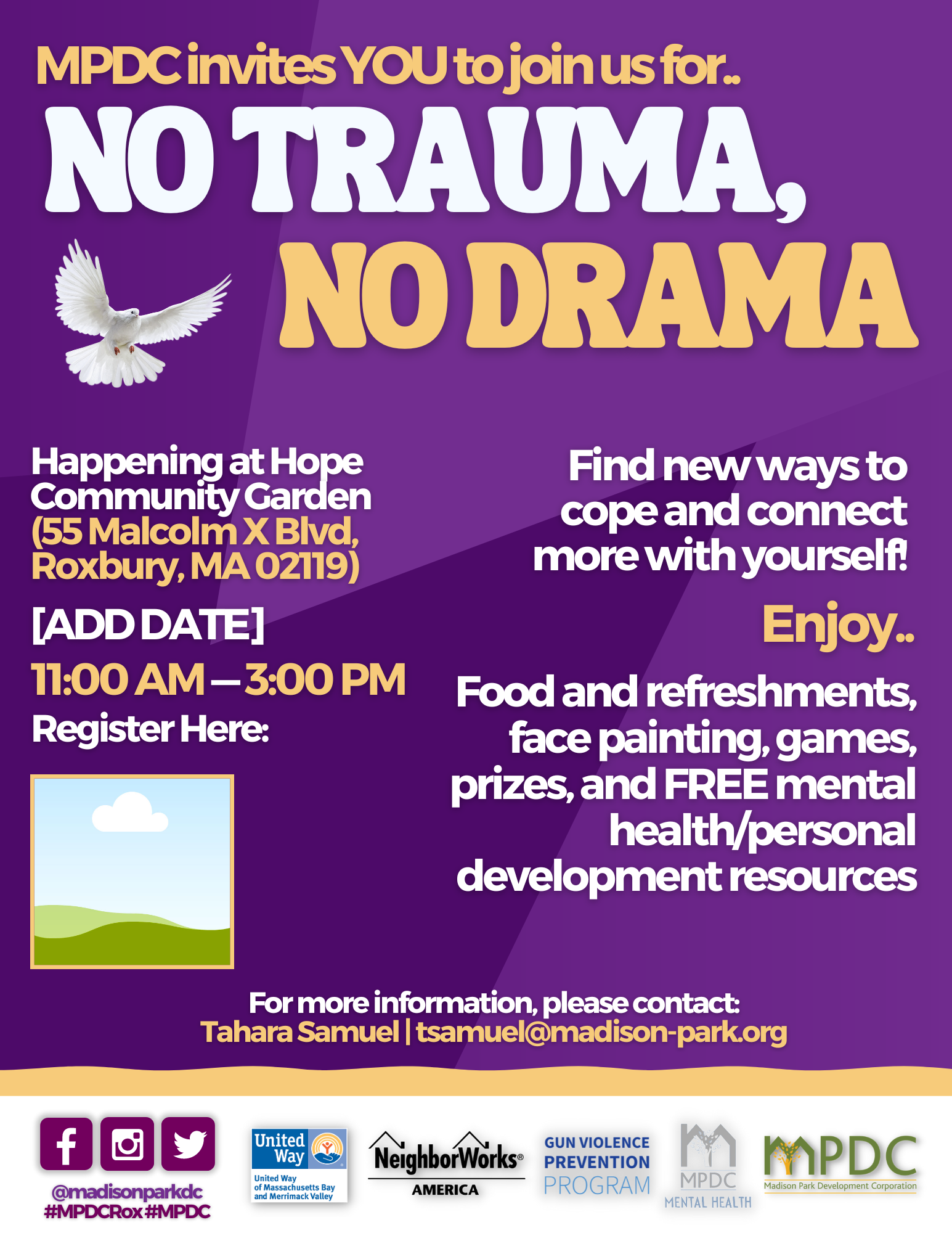 MPDC's annual No Trauma, No Drama event is back and invites you to join in on a day of fun at Hope Community Garden – Click to get more details!