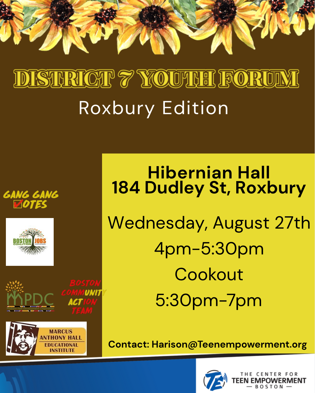 Boston’s District 7 Roxbury Youth ForumWednesday, August 27, 20254:00 PM – 7:00 PMHibernian Hall, 184 Dudley Street, Suite 200, Boston, MA 02119 Join us for Boston’s District 7 Roxbury Youth Forum, a powerful in-person gathering where young people come together to speak up, share ideas, and drive real change in their community. Hosted by Teen […]