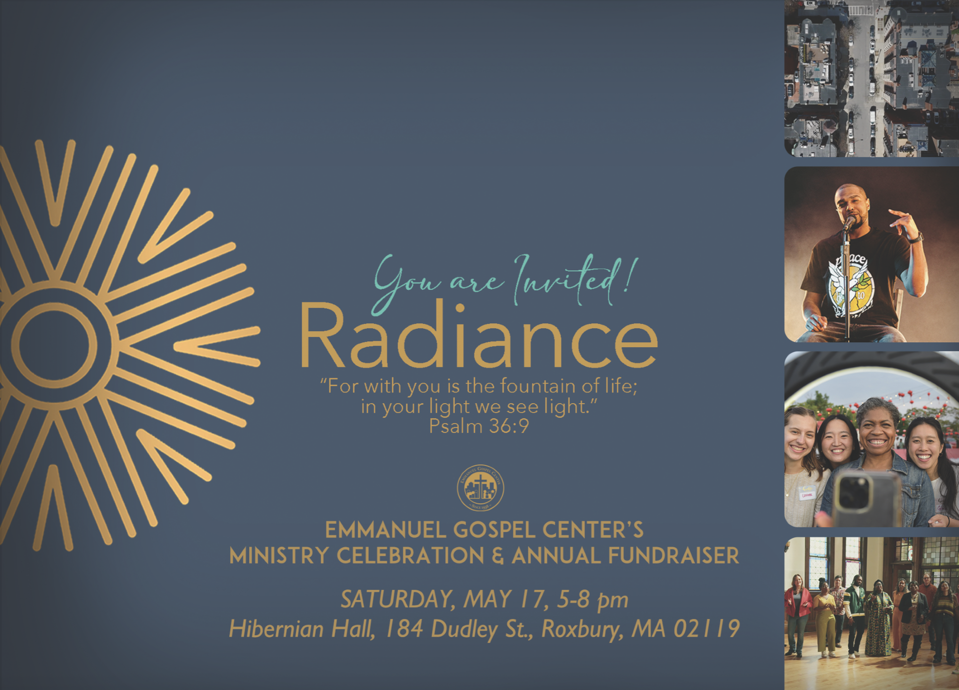 Radiance – EGC’s Ministry Celebration & Annual FundraiserSaturday, May 17, 20255:00 PM – 8:00 PMHibernian Hall, 184 Dudley Street, Roxbury, MA 02119 You are invited to Radiance—a joyful evening of celebration, connection, and community in support of the Emmanuel Gospel Center (EGC). This free event will include delicious food, original music, inspiring updates, and the […]